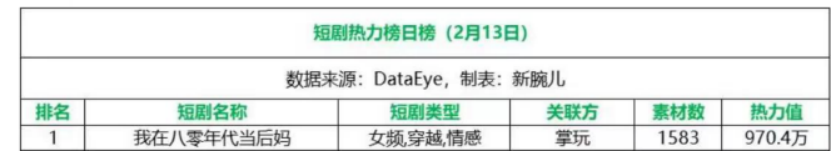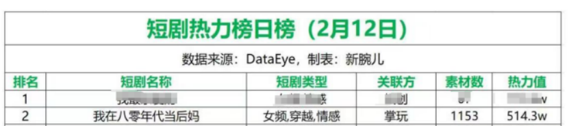 微风短剧联合DataEye数据显示,在2月12日,这部剧以514.3万的热力值排名第二。